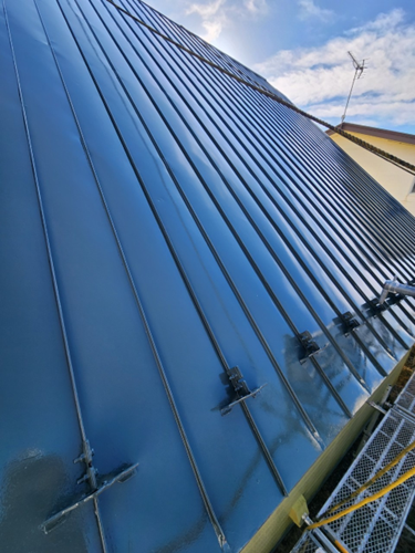 屋根材の継ぎ目や固定金具まわりまでしっかりと塗装され、細部まで配慮された仕上がりです。