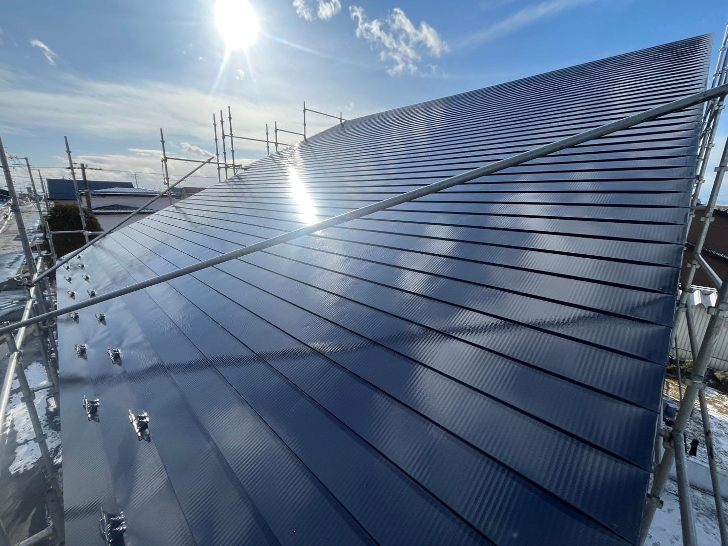 屋根はマットな質感の中にも上品な光沢があり、陽光に照らされるとその性能と仕上がりの良さが一目でわかります。