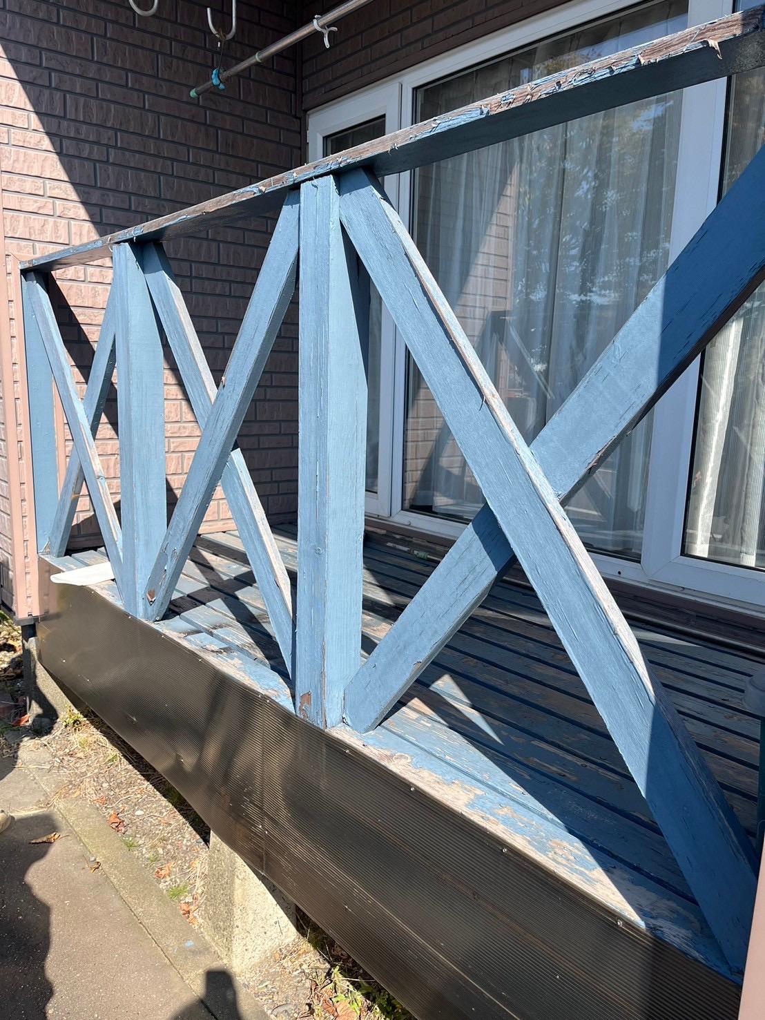 ウッドデッキは塗装の剥がれや木部の傷みが見られ、手すり部分にも破損が出ていたため、安全性と美観の両面から改修が必要な状態でした。