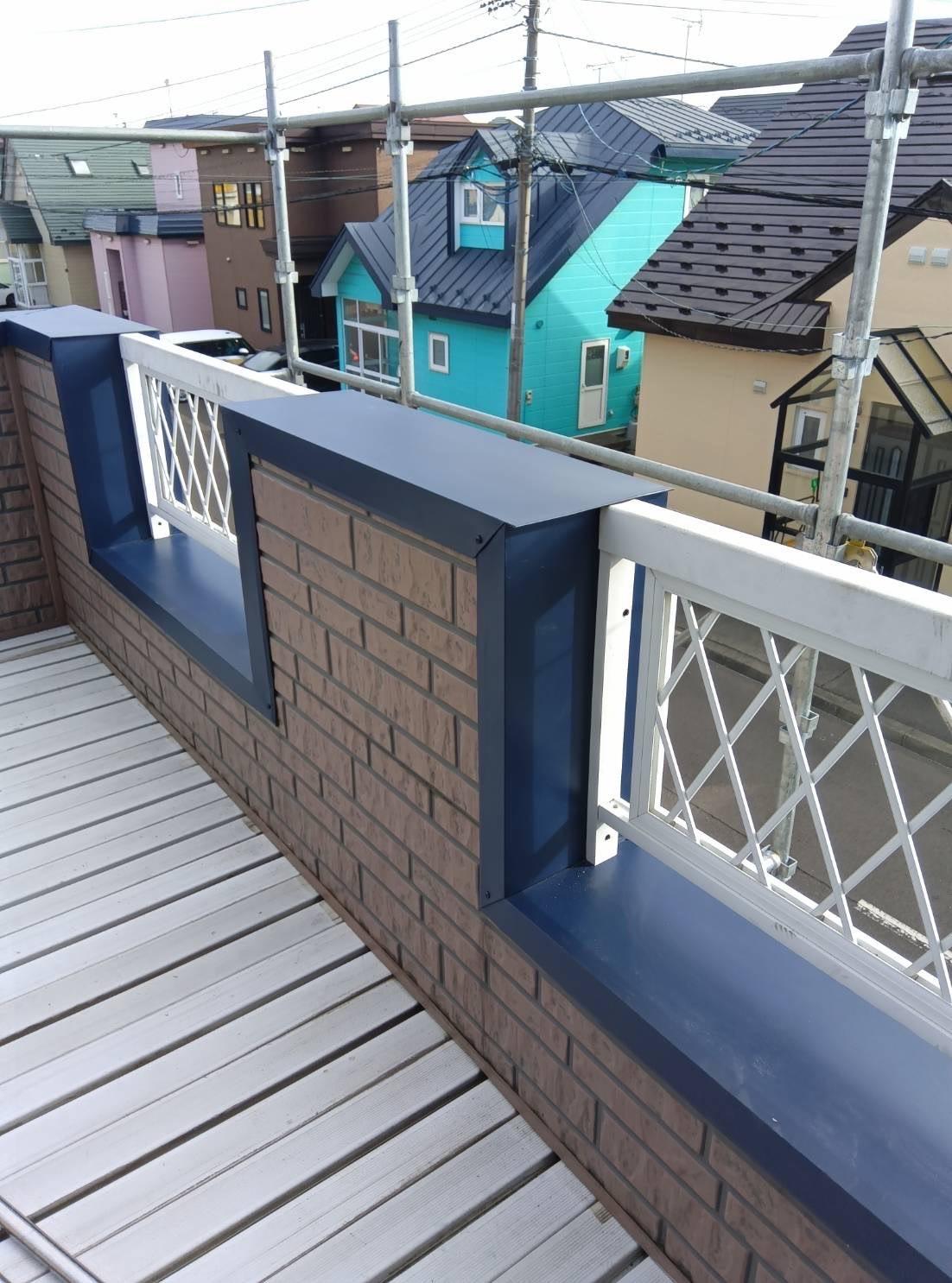 また、バルコニーの笠木(かさぎ)部分にも板金を巻くことで、雨水の侵入を防ぎ、腐食の進行を抑制。